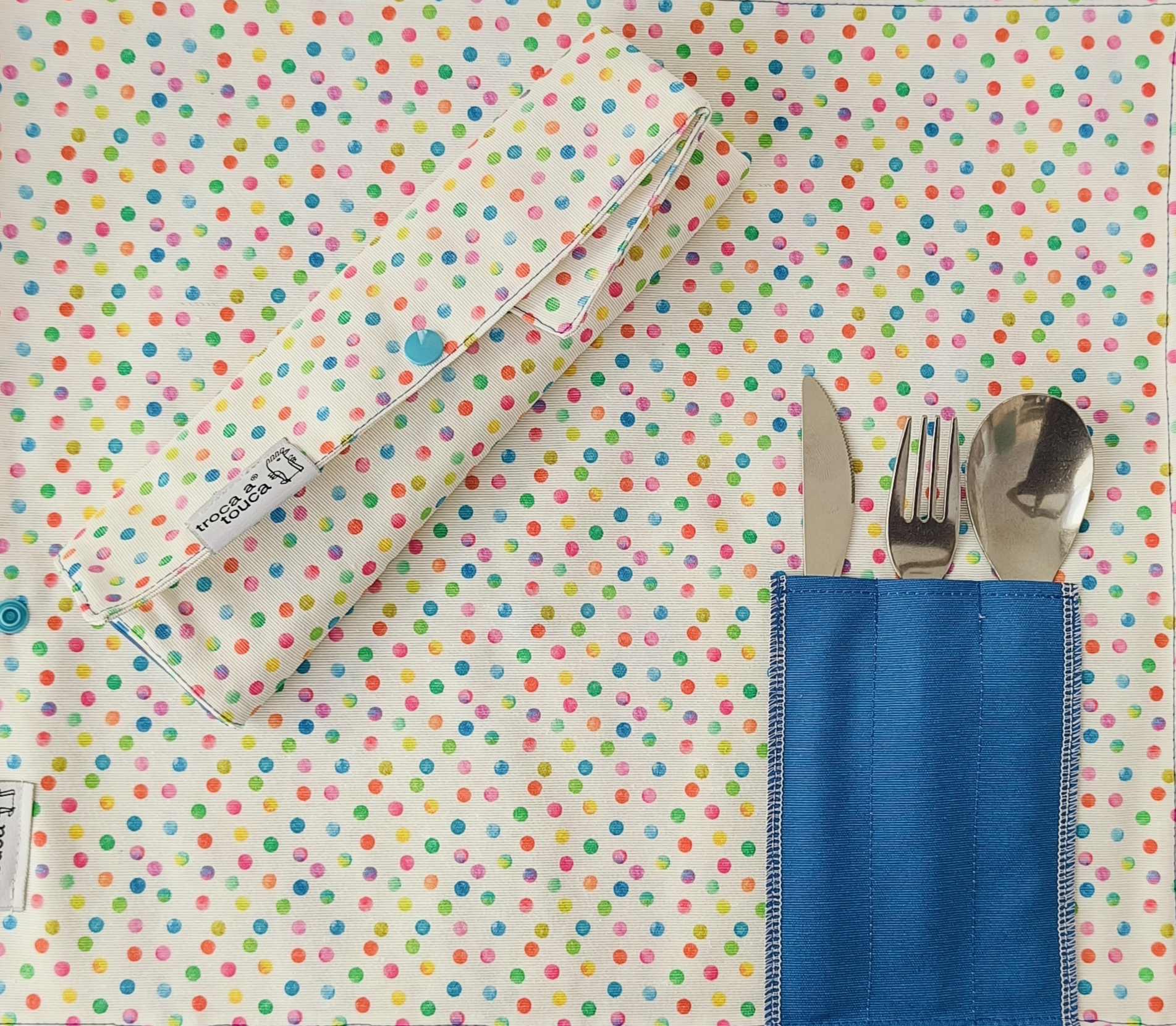 Individual com tecido resinado, repelente à água, gorduras e outros líquidos. Talheres incluídos.