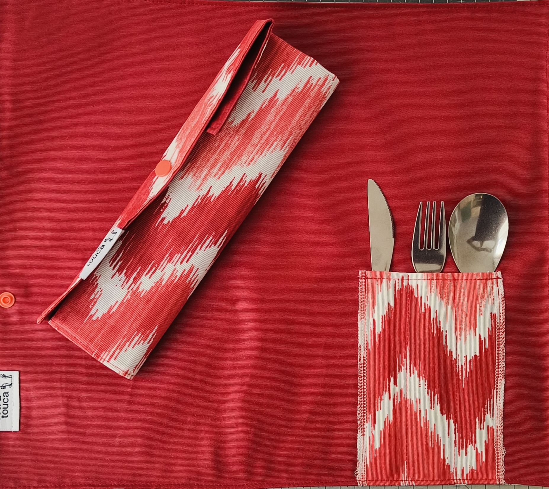 Individual com tecido resinado, repelente à água, gorduras e outros líquidos. Talheres incluídos.