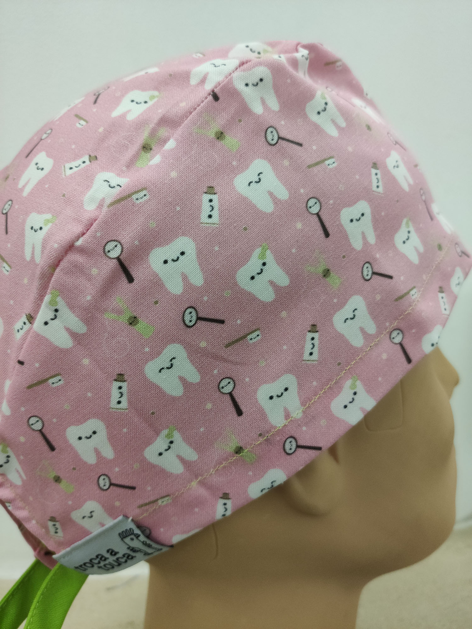 Touca fita, tema dentes. Dentes rosa pequenos, fio dentário, escova e pasta de dentes.